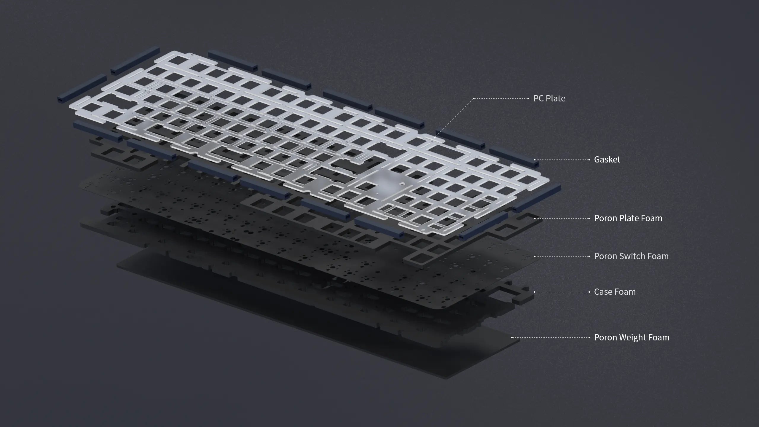 PCB and Bottom Case are made of lighter PORON material. To reduce resonance, many tests were done on the foaming material this time. We made the PORON lighter and the foam pores dense. Every minor detail matters a lot, with the current poron, the sound is more concentrated and is deeper than with normal dampeners.