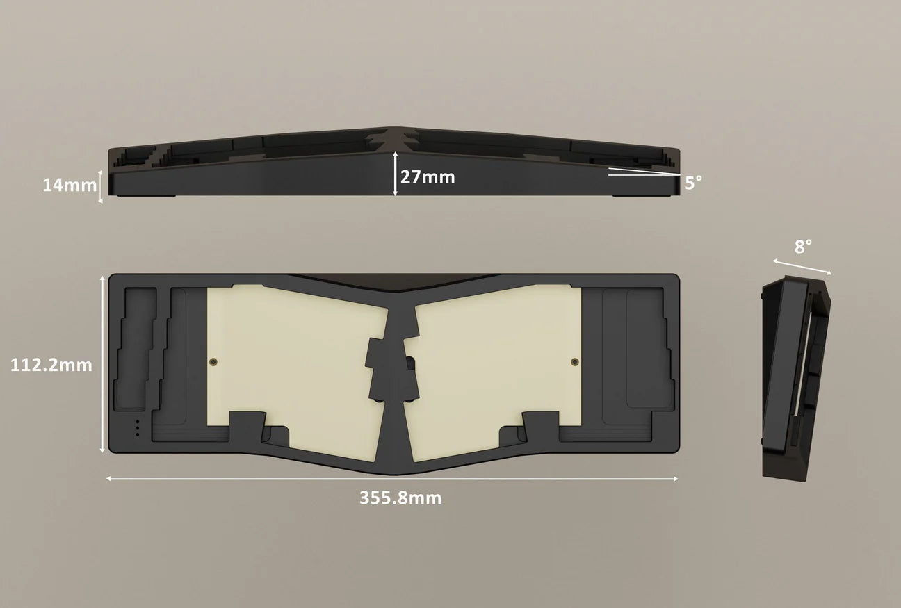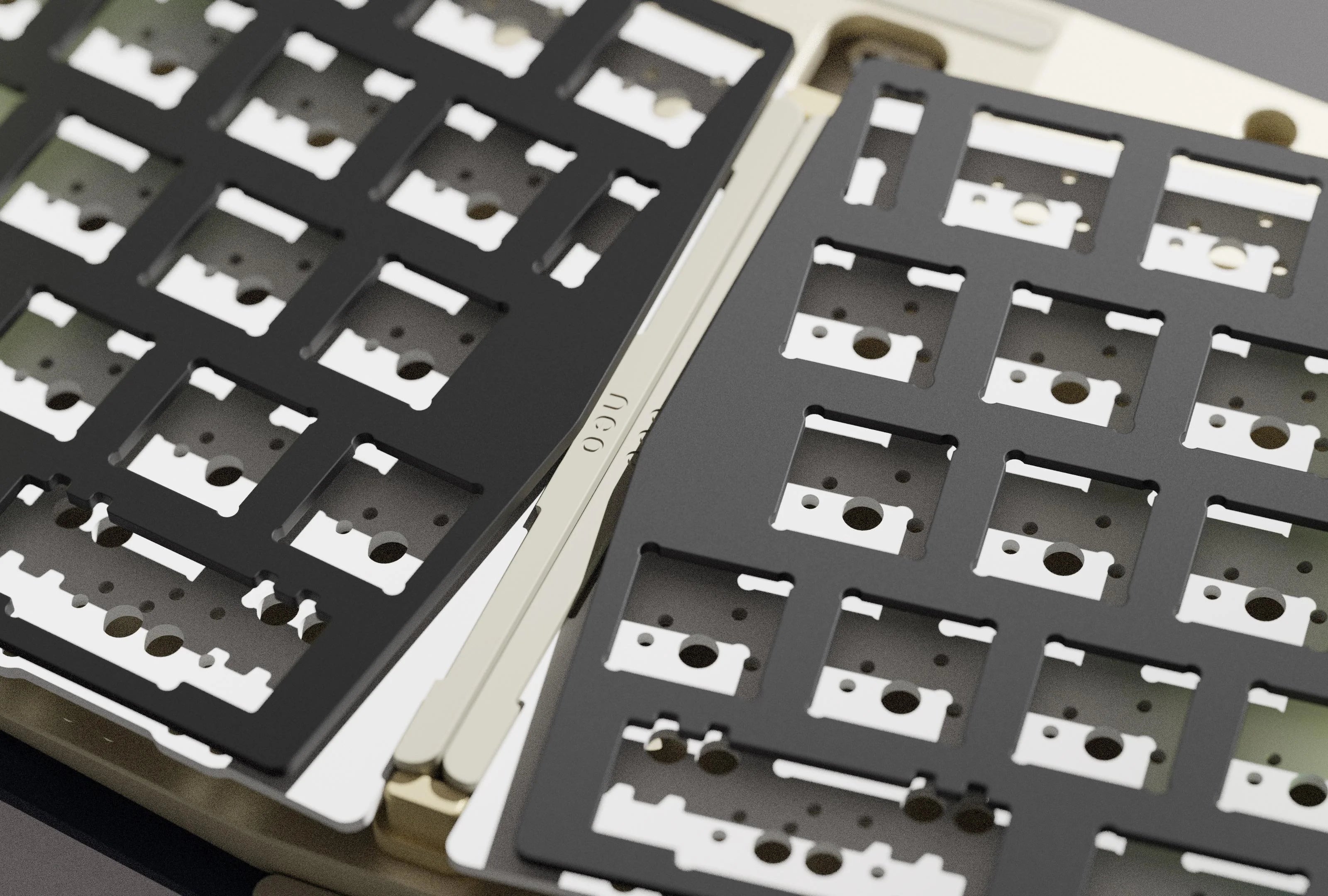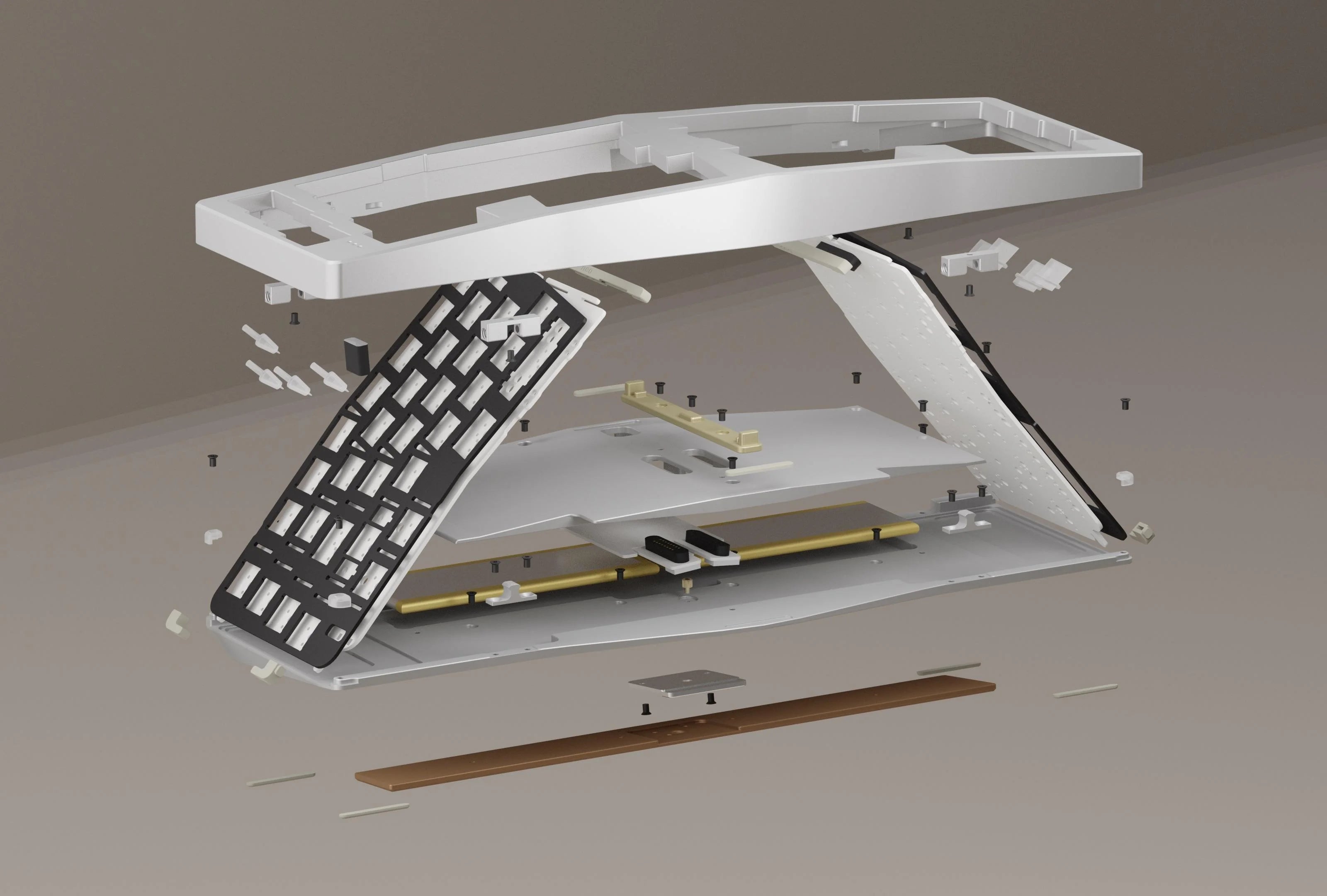 During the prototyping phase, it was discovered that the standard gasket mount couldn’t deliver consistent typing feedback or optimal acoustic performance in a tenting keyboard. As a result, the gasket is repositioned to the middle and corners for the Ergo. This adjustment offers a more evenly distributed typing and acoustic experience across the entire keyboard.
