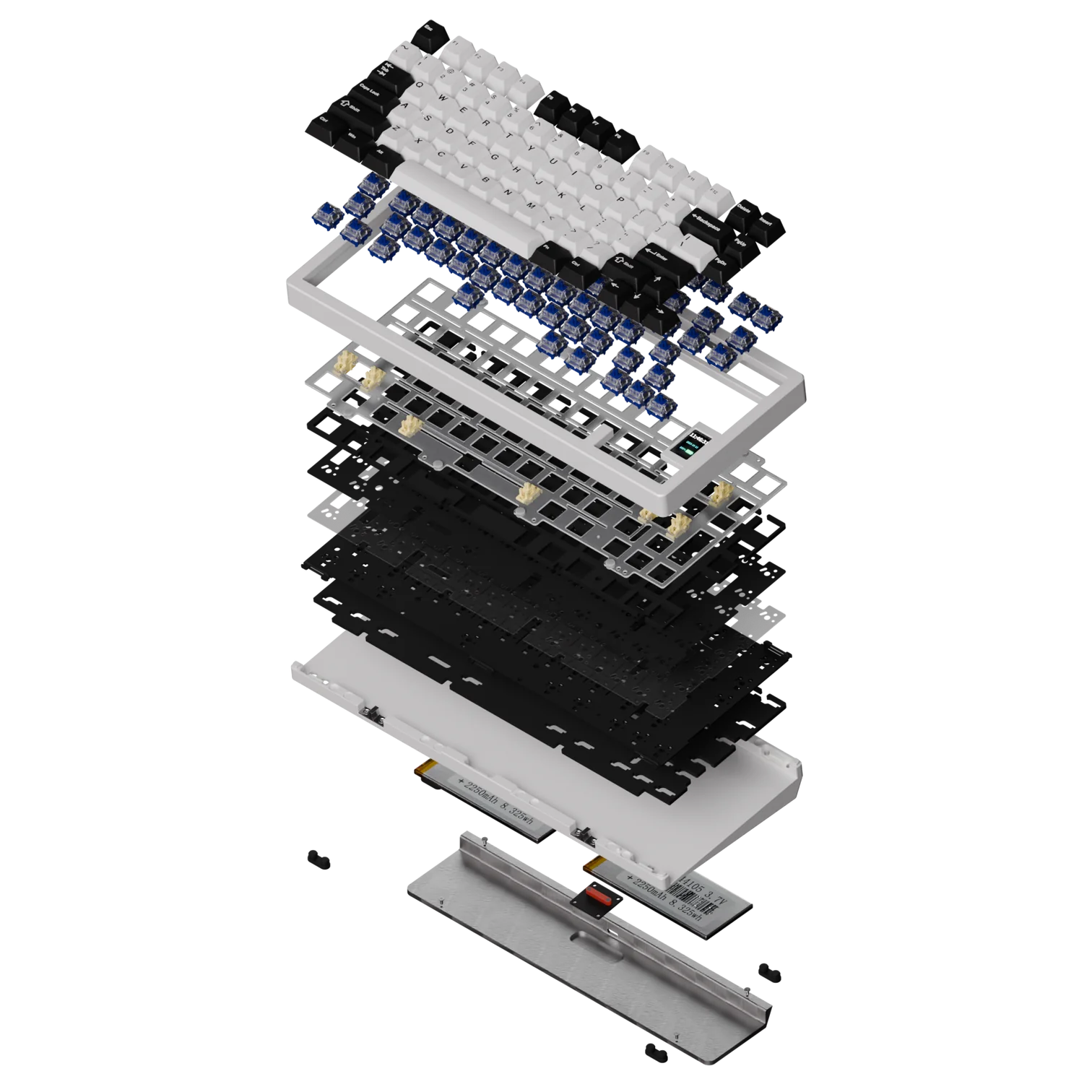 The ND75 Keyboard by Chilkey offers a 75% layout with a sleek 6.5° typing angle and a sturdy CNC aluminum case. Available in Pure White, Jet Black, Mountain Blue, and Elegant Purple, it features a polycarbonate plate, Tri-Mode PCB with per-key RGB, and hot-swappable switches. Enjoy smooth typing with factory-lubed Gateron EF Dopamine Blue switches and durable Doubleshot PBT keycaps. Get yours now and experience precision and style!