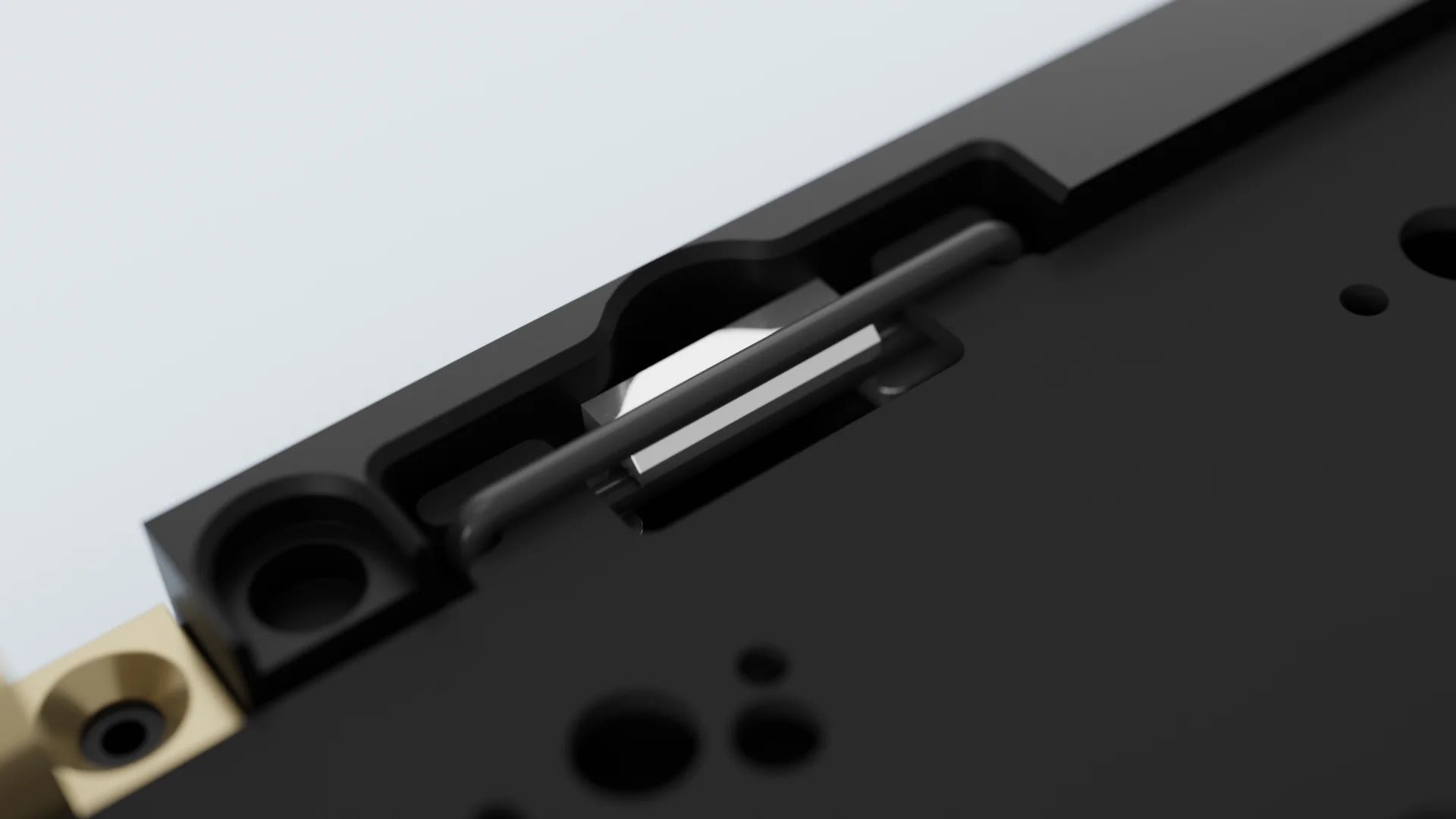 This is an interesting mounting system. Designed to enable the entire inner assembly to closely follow the fingers during high-frequency typing, it results in a high-frequency bounce.
